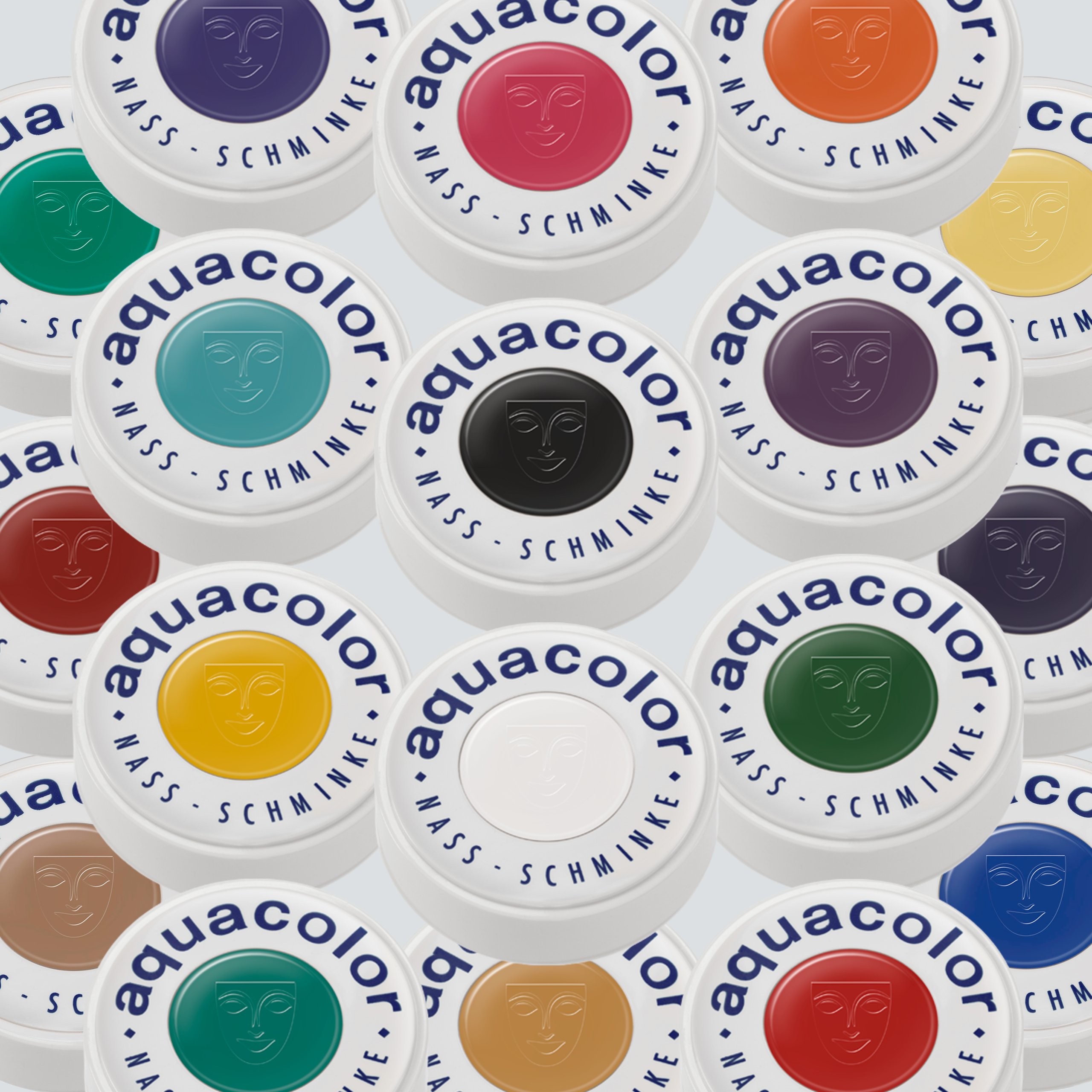 Aquacolor es un maquillaje compacto a base de glicerina, de colores intensos, con ingredientes de calidad superior, utilizados comunmente en cremas para la piel. Aquacolor se utiliza principalmente como maquillaje para la cara y pintura corporal. Se aplica fácilmente con una esponja de maquillaje o un pincel ligeramente humedecido. Después del secado, se puede pulir suavemente con una toalla o con la mano. No es necesario utilizar polvo fijador. Se recomienda utilizar spray fijador, si el maquillaje se somete a condiciones extremas. Aquacolor es de uso universal, resistente a roces y se quita fácilmente con agua y jabón. Aquacolor está disponible en una amplia variedad de colores, que incluyen tonalidades piel y tonos vivos. Certificado ECARF.
