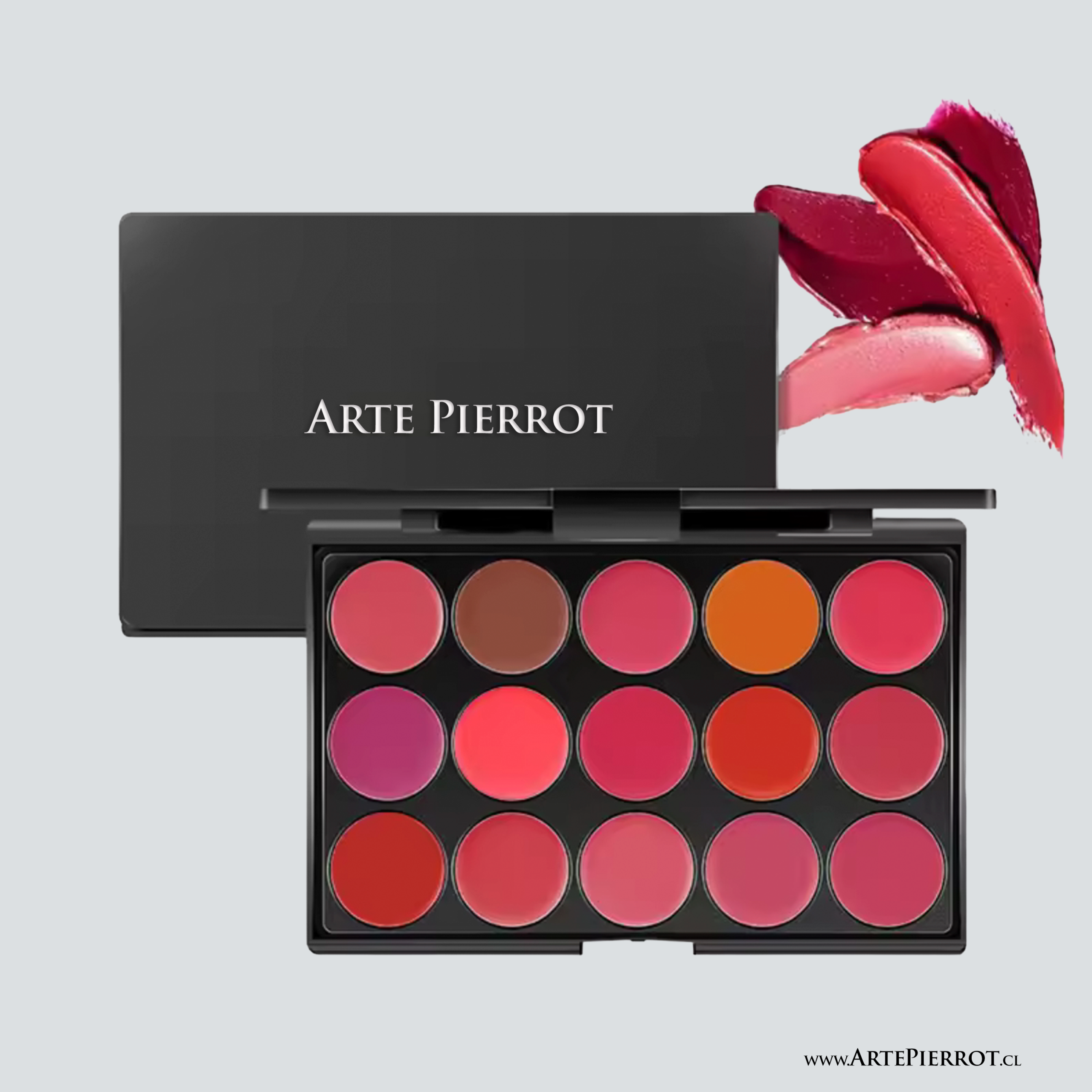 Paleta de labiales de 15 tonos mate, hidratantes y que no se decolora.