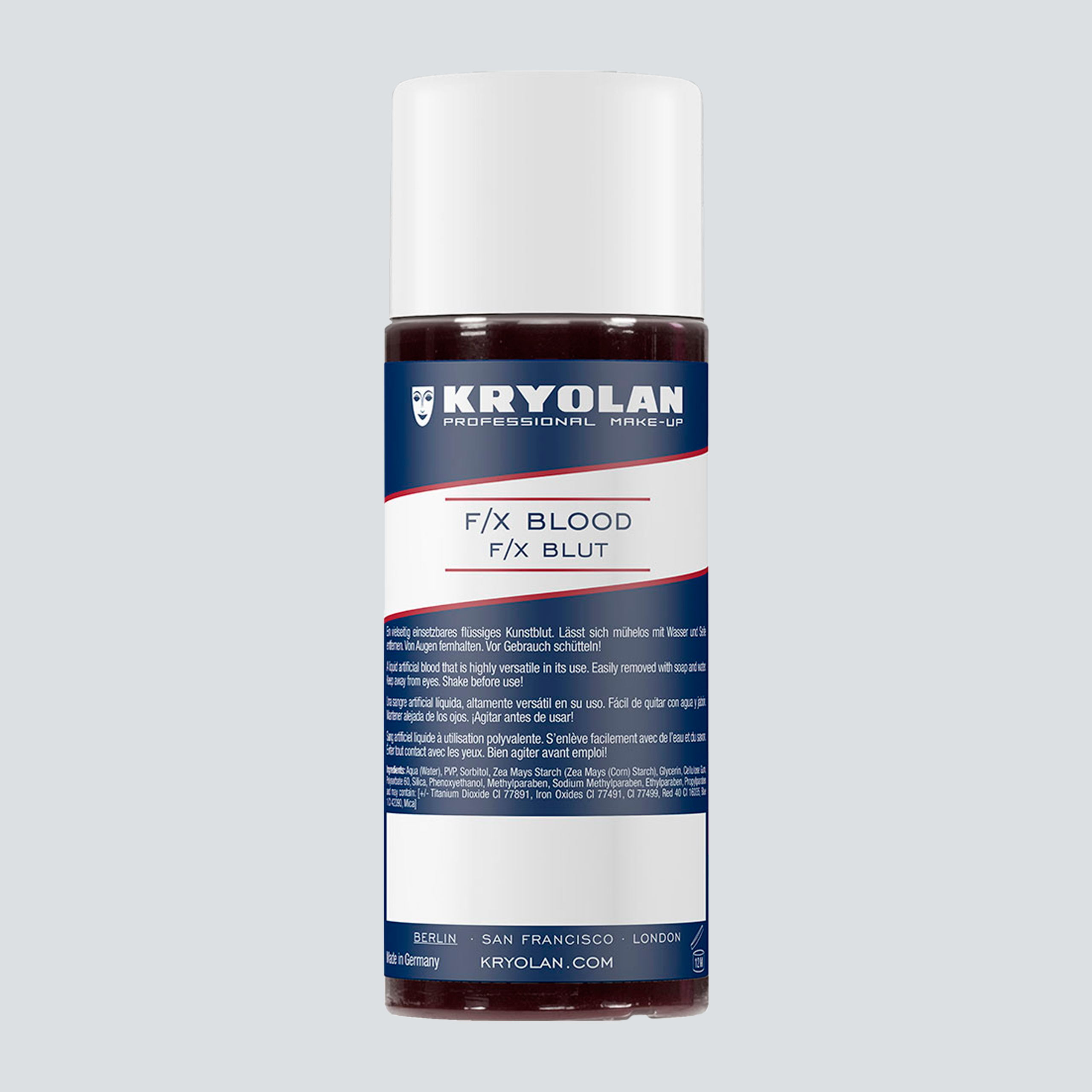 F/X Blood es una sangre artificial líquida, muy versátil en su uso. Se seca completamente sobre la piel, es resistente a roces y no mancha. Sin embargo, por su brillo, genera la impresión de tratarse de sangre fresca y húmeda. Este tipo de sangre está disponible en dos tonos: claro y oscuro. F/X Blood se extrae fácilmente de la piel con agua tibia y jabón. Por lo tanto, se puede lavar también de la mayoría de los textiles.